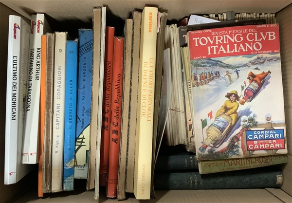 Quattro cartoni di libri per bambini e diversi fascicoli della rivista Touring
