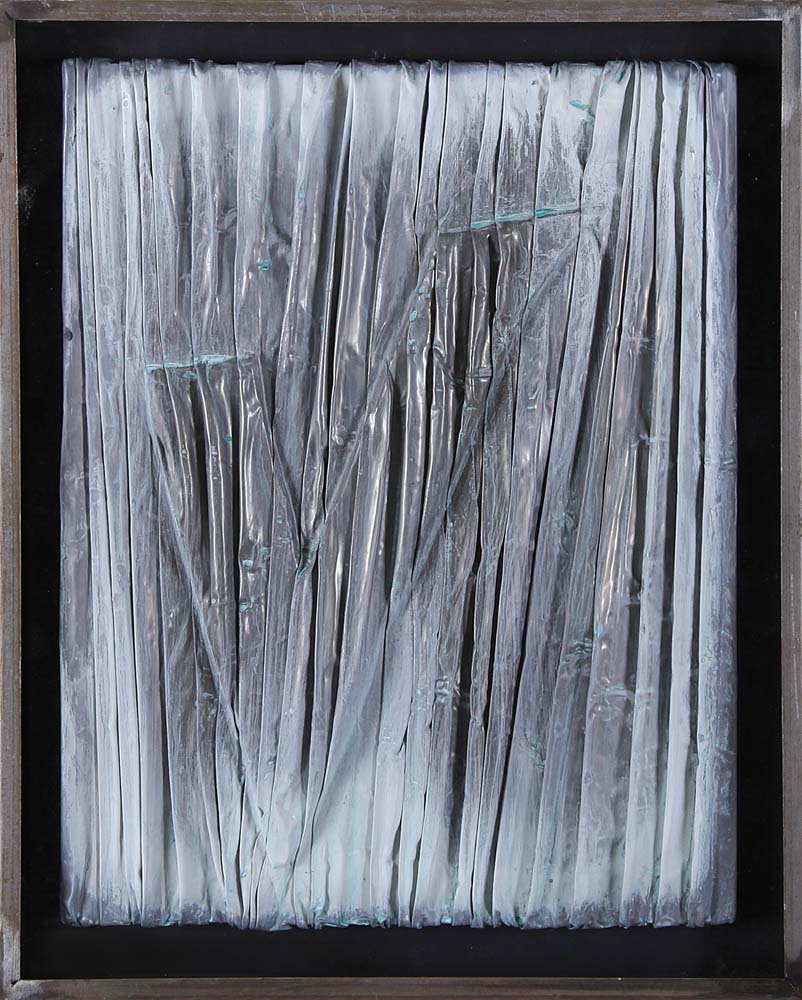 acrilico e piombo sagomato applicato su tavola 46,5x36 con cornice dell'artista cm. 53,5x43,5, firma, titolo, anno e timbro della Galleria Ammiraglio Acton (MI) al retro.