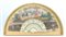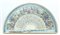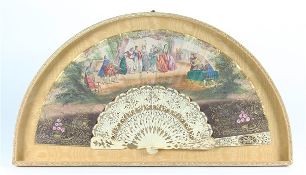 Arte del secolo XIX. Lotto di due ventagli con stecche in osso traforato, inciso e dorato, pagine in carta stampata e dipinta ad acquerello e tempera raffiguranti una scena storica con partita di badminton al verso ed una bucolica firmata Bertrand. Entro teche in tessuto (difetti)