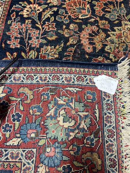 Tappeto preghiera Keshan, Persia, secolo XX. Mirab decorato con vaso e rami fioriti su fondo blu notte (cm 203x135) (difetti)