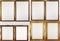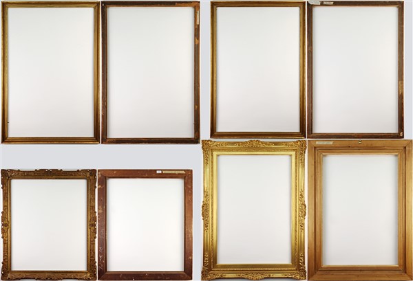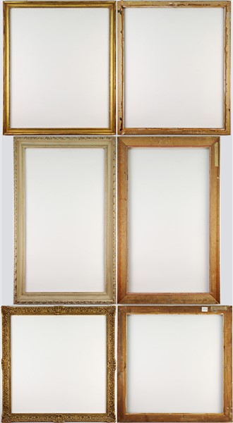 Lotto composto da sette diverse cornici in legno e altri materiali. Alcune dorate. (cm max 104x63) (difetti). Luce di ogni cornice iscritta al retro