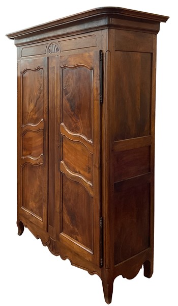 Armadio in noce a due ante pannellate e sagomate, cappello aggettante. Francia,