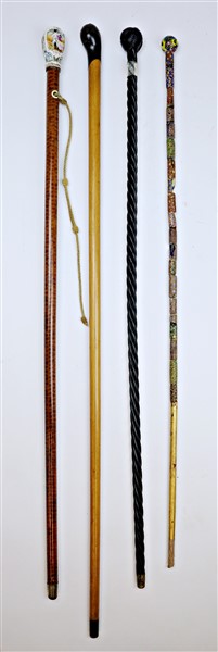 Manifatture differenti. Lotto composto da quattro bastoni da passeggio in materiali differenti tra cui uno con presa in porcellana dipinta in policromia (h. max cm 94) (difetti)