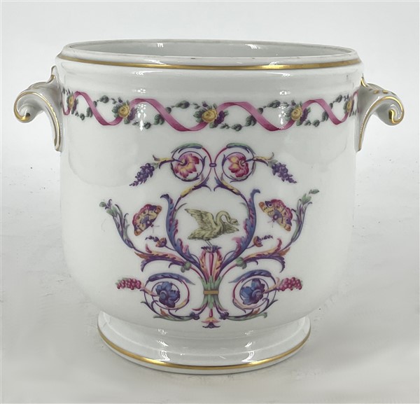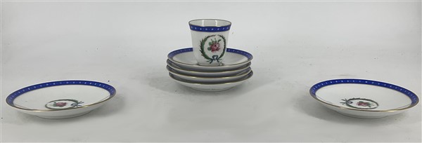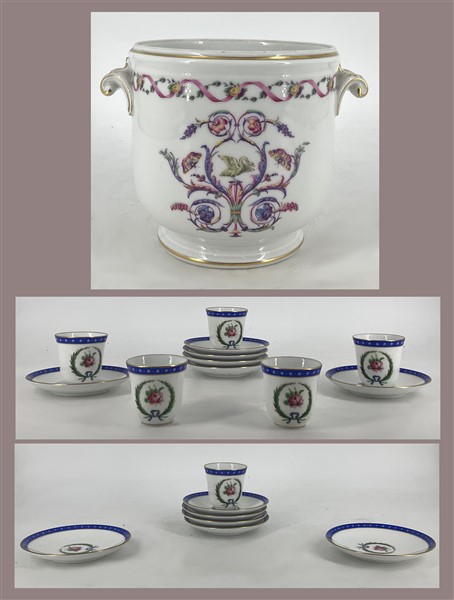 Manifattura Richard-Ginori. Lotto composto da un set da caffè in porcellana composto da sei tazze con piattino e un piccolo cache-pot biansato in porcellana, decoro a floreale in policromia e profili in oro (h max cm 14) (lievi difetti)