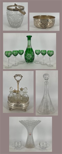 Due cartoni contenenti diversi oggetti in vetro, cristallo e metallo argentato di differente uso e forma (difetti)