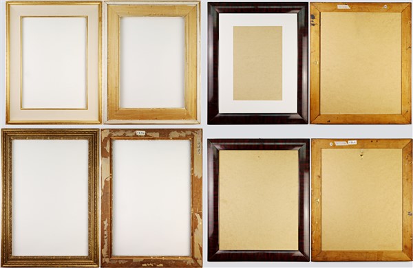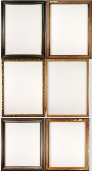 Lotto composto da sette diverse cornici in legno e altri materiali. Alcune dorate (cm max 91x71,5) (difetti). Luce di ogni cornice iscritta al retro