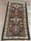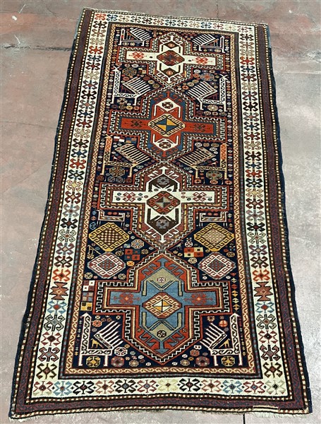 Tappeto Akstafa, Caucaso, fine secolo XIX. Decoro con quattro medaglioni policromi su fondo blu scuro, campo cosparso di simboli floreali ed animali stilizzati, inclusi i pavoni tipici della provenienza, bordura a granchi su fondo bianco (cm 174x95) (difetti)