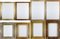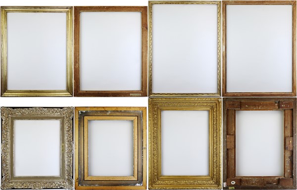 Lotto composto da dieci diverse cornici in legno e altri materiali. Alcune dorate (cm max 87x72) (difetti). Luce di ogni cornice iscritta al retro