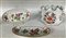 Manifattura Richard Ginori. Rinfrescatoio biansato a bordo mosso in porcellana profilata in oro e decorata in policromia ''al tulipano" (h. cm 16,5; d. cm 21) unito ad una coppia di vassoi di forma ovale in porcellana profilata in oro a bordo traforato, decorati in policromia a fiori di diversa manifattura (cm 26,5x15,5) (difetti e restauri)