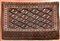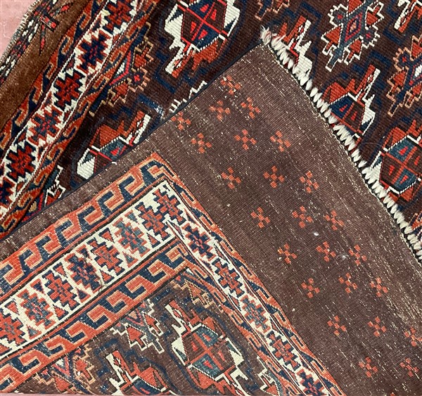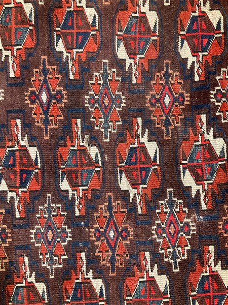 Tappeto Torba Yomut, Turkestan occidentale, fine secolo XIX. Decoro con file di Gul nei toni del bianco, blu e rosso su fondo bordeaux scuro (cm 119x78) (difetti)