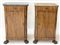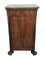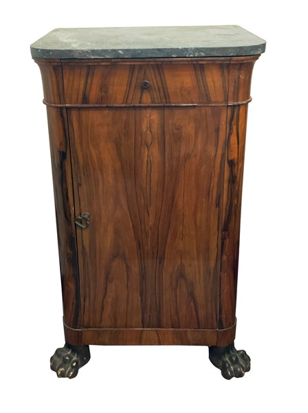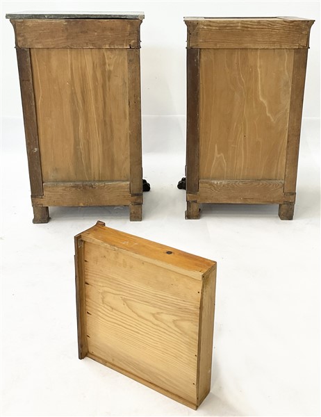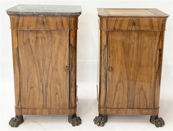 Coppia di comodini lastronati in piuma ad un'anta ed un cassetto, piedi a zampa ferina in legno laccato, piani in marmo di cui uno rotto. Secolo XIX (cm 50x85x42) (difetti)