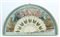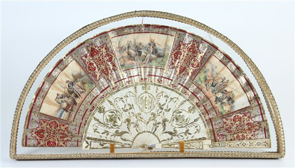 Arte del secolo XIX. Lotto di due ventagli con stecche in osso inciso, dorato e traforato, di cui uno con guardia in madreperla, pagine in carta stampata e colorata raffiguranti uno scene di genere al recto e al verso, l'altro figure mitologiche. Teche in tessuto (difetti)