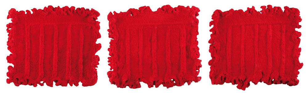 pittura rossa su 3 elementi di cm. 36x40 cadauno, totale cm. 36x120, firma, titolo, anno e località (Milano) sull'elemento di sinistra (n° 1), completa di 3 fondalini in carta dipinta in rosso dall'artista, opera priva di cornice.