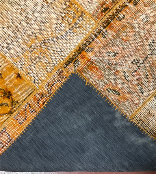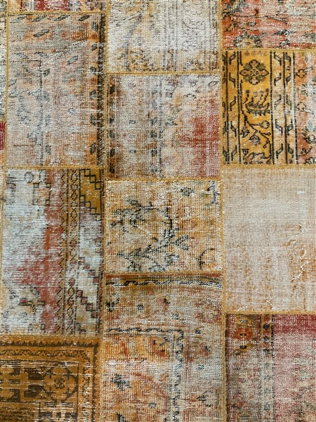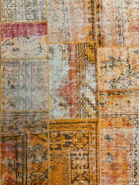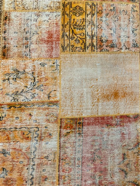 Tappeto patchwork, secolo XX. Formato da frammenti di tappeti cuciti ed appositamente usurati (cm 238x180) (difetti)