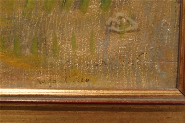 Firma indecifrata "Paesaggio lacustre con figura e pecora" olio su compesato (