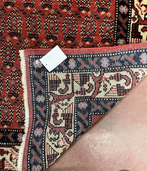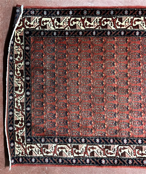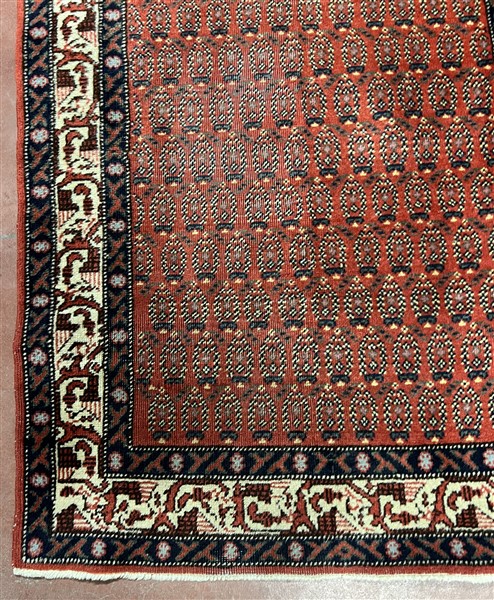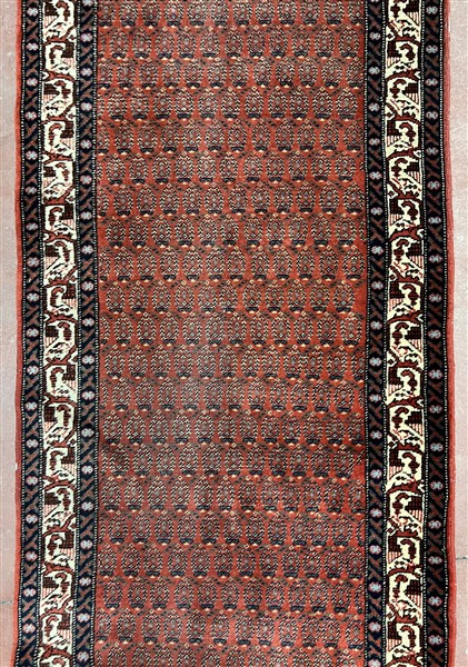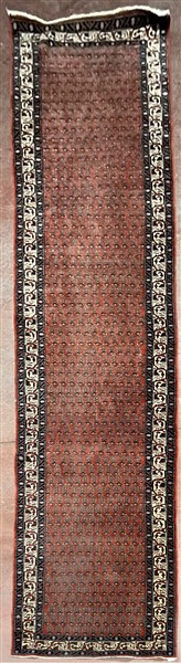 Tappeto passatoia Serabend, Persia, secolo XX. Decoro con file di Gul su campo mattone (cm 489x89) (difetti e rapature)