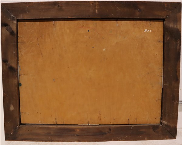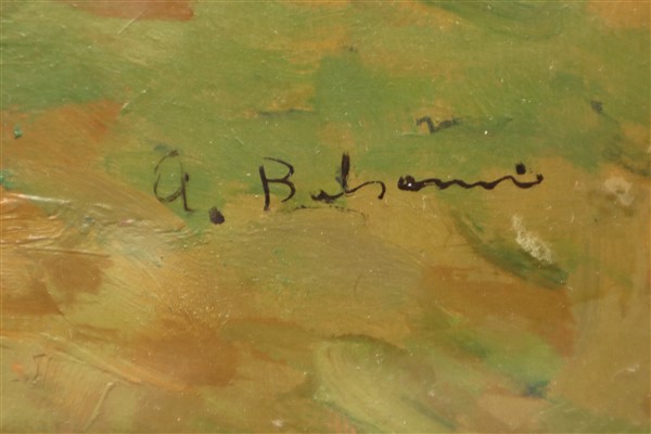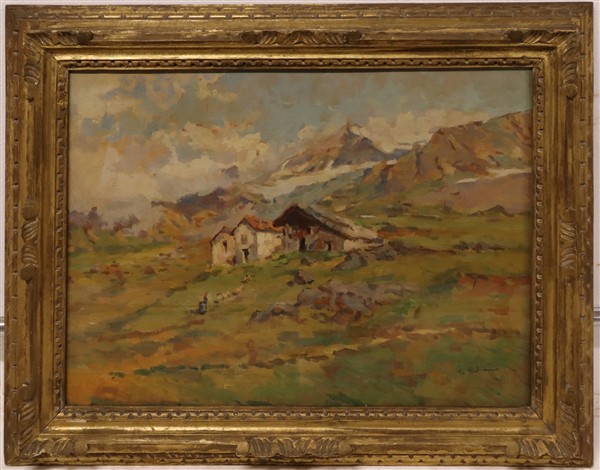 Firma indecifrata "Paesaggio montano con baite e contadina" olio su compensat
