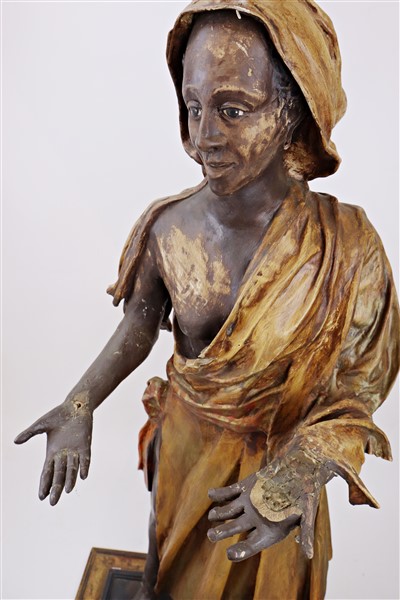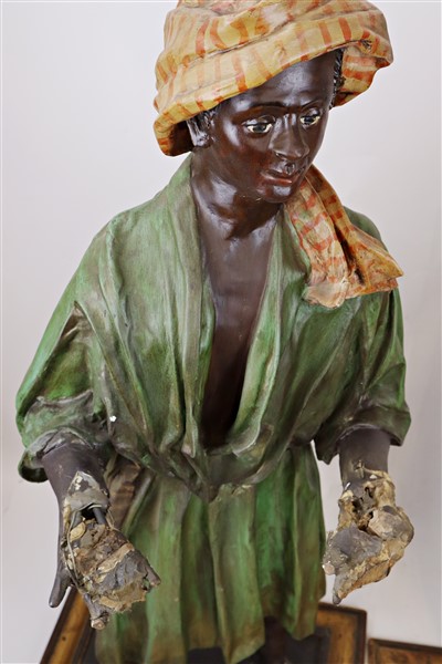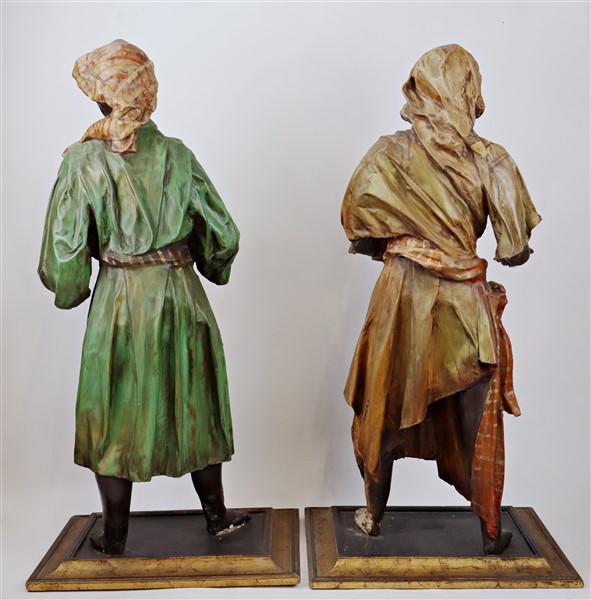 Due sculture raffiguranti mori stanti con braccia protese, legno e cartapesta dipinta (h cm 90) (difetti e mancanze)