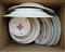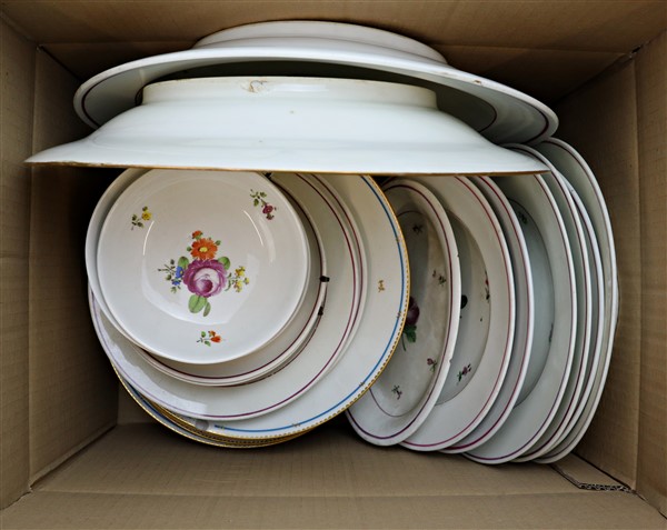 Manifattura di Vienna, secolo XVIII-XIX. Lotto composto da numerosi piatti e piattini di diverso decoro, in un cartone (difetti)