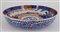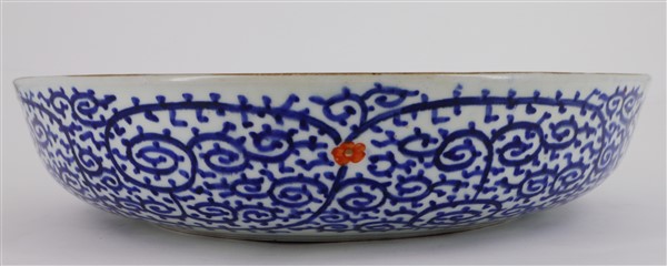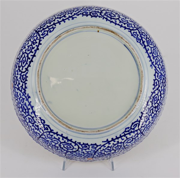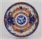Piatto in porcellana imari con decoro di personaggi in un giardino nei toni del blu oro e rosso ferro