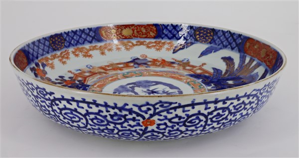 Piatto in porcellana imari con decoro di personaggi in un giardino nei toni del