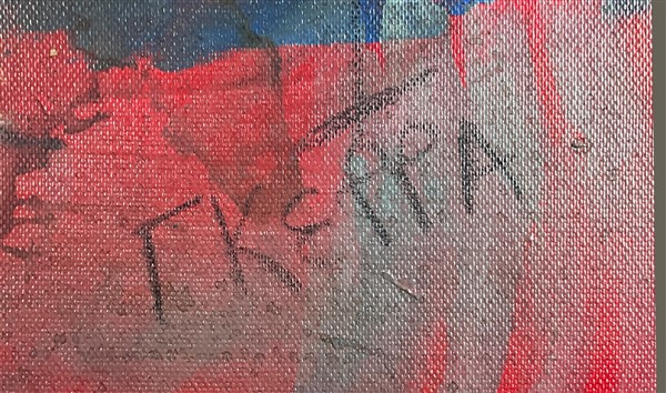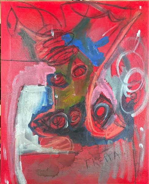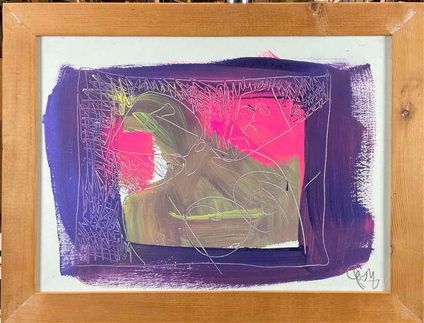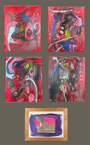 Lotto composto da quattro acrilici su tela (cm 50x40) firmati e titolati al retro uniti ad una tecnica mista su carta di autore indecifrato (cm 32x43) siglata in basso a destra e in cornice