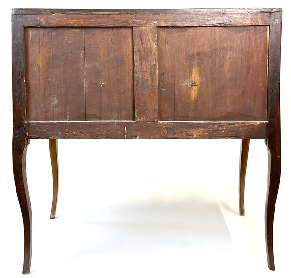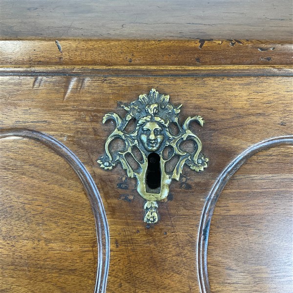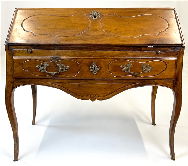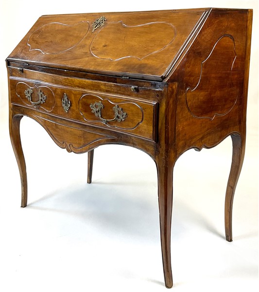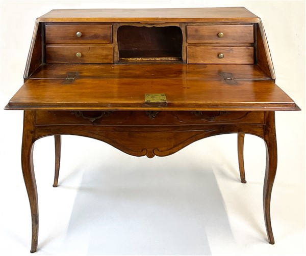 Ribalta in noce scanalato, fronte a un cassetto e calatoia che rivela quattro cassetti e vano con segreto, gambe mosse. Secolo XVIII (cm 106x103x55) (difetti)