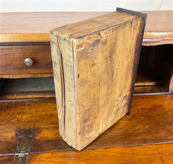 Ribalta in noce scanalato, fronte a un cassetto e calatoia che rivela quattro c
