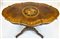 Tavolo a biscotto impiallacciato e intarsiato in legni di varie essenze a motiv