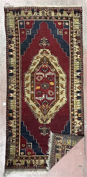 Tappeto Konya, Anatolia, secolo XX. Decoro con medaglione con volatili su fondo rosso, bordura con architetture su fondo cammello (cm 256x103) (difetti)