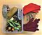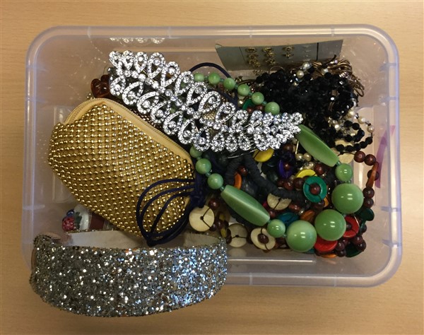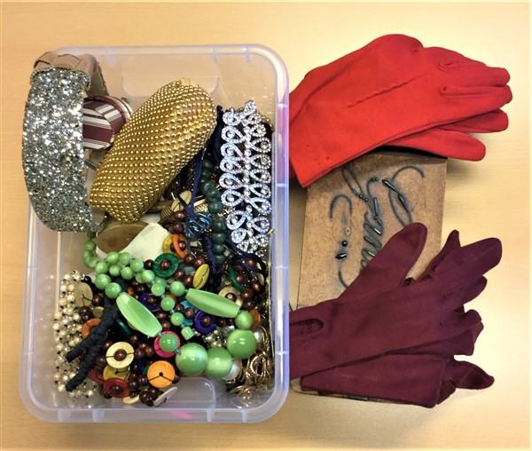 Lotto composto da una scatola di bigiotteria in vari materiali contenente numerosi orecchini, bracciali, anelli, fermagli per capelli, collane e un cerchietto per capelli unito ad una scatola in legno portaguanti con diverse paia di guanti di vari colori (difetti e mancanze)