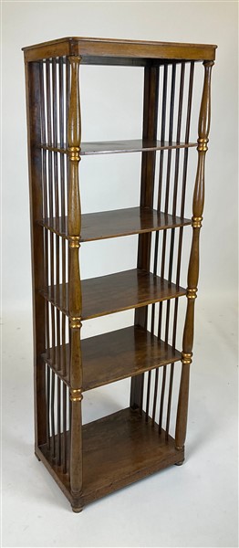 Etagère in noce a cinque ripiani con montanti anteriori torniti in parte dorati e fianchi a listelli. Secolo XIX (cm 55x164x37) (difetti)