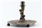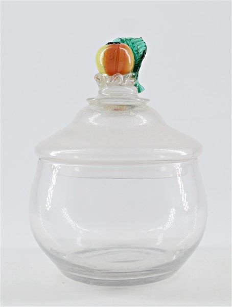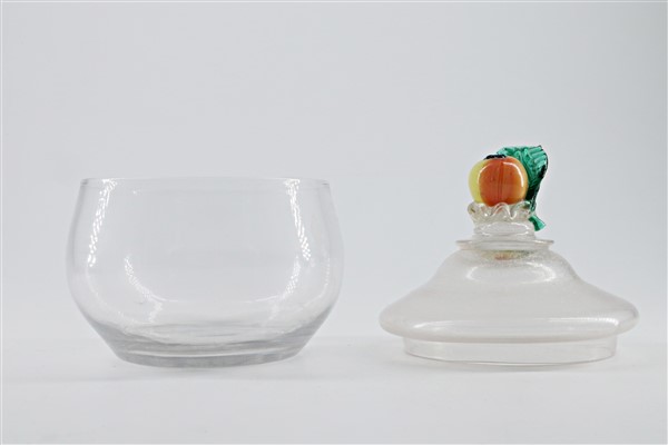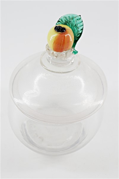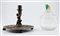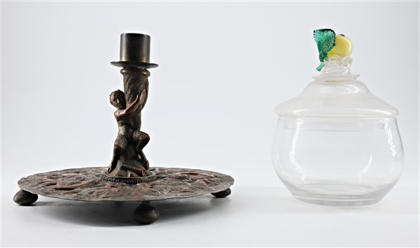 Lotto composto da un candeliere in rame del secolo XIX decorato a fauno e sbalzato nella base a scena di battaglia e un vasetto in vetro con coperchio decorato a frutta (difetti)