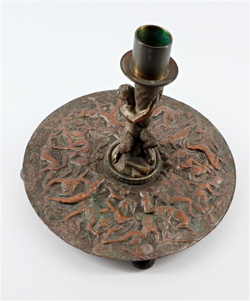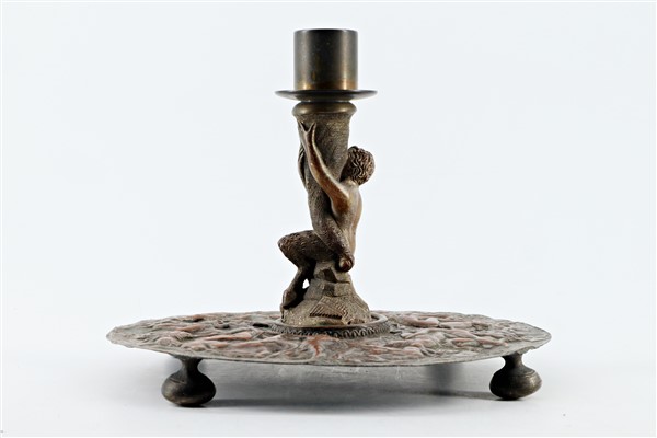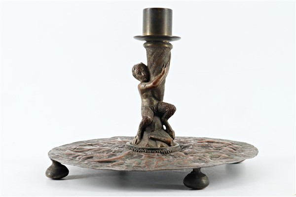 Lotto composto da un candeliere in rame del secolo XIX decorato a fauno e sbalz