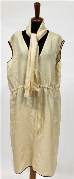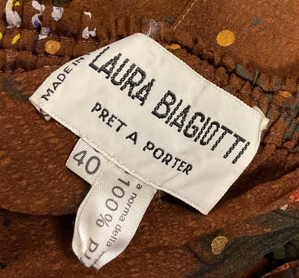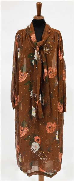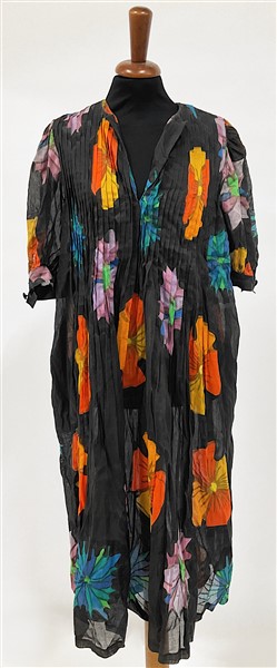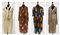 Lotto composto da un vestito longuette in maglina a maniche lunghe con sciarpetta en pendant, un vestito color panna smanicato con coulisse in vita e sciarpetta en pendant. un vestito a mezza manica in voile di cotone plissettato con fiori stilizzati multicolore su fondo nero e un completo, casacca lunga con gonna e fusciacca, nei toni del ruggine (tg. 42/44) (difetti e segni d'uso)