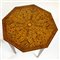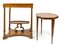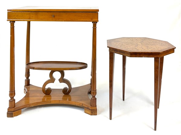 Lotto composto da un tavolino da lavoro in ciliegio con piano incernierato celante vari scomparti, gambe a colonna raccordate da pianetto sagomato centrato da alzata ovale (cm 61,5x78x41,5) unito a un tavolino con piano ottagonale intarsiato (d cm 45, h cm 53) (difetti)