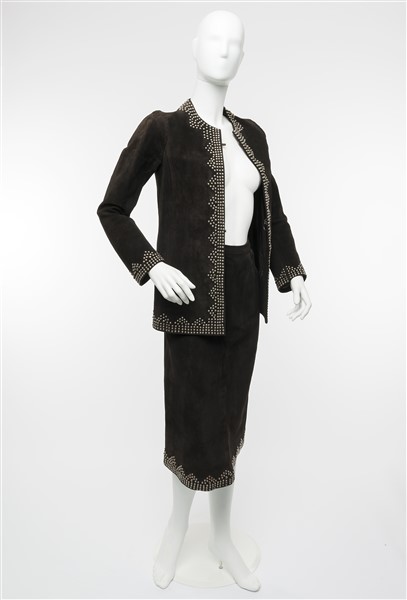 Yves Saint Laurent Paris: completo gonna scamosciato color testa di moro, con bordature in borchie color nickel (difetti)