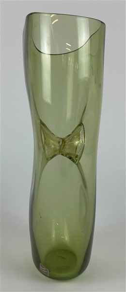 Vaso in vetro soffiato trasparente verdino con applicazione passante decorata a foglia d'oro. Murano, anni '80. Firmato a punta alla base e recante etichetta della manifattura. (difetti)