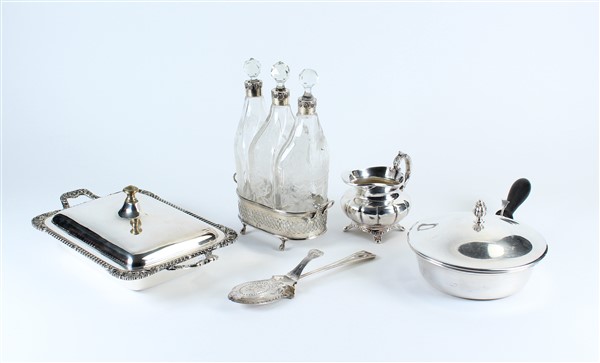 Lotto composto da diversi oggetti in metallo argentato di differente uso, forma