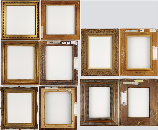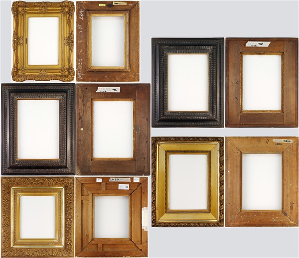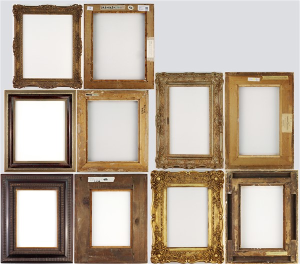 Lotto composto da quindici diverse cornici in legno e altri materiali. Alcune dorate. (cm max 51x51) (difetti). Luce di ogni cornice iscritta al retro
