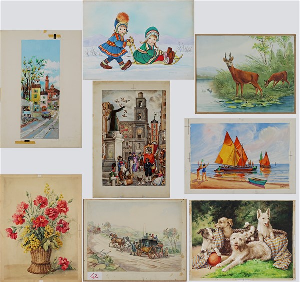 Lot 562 | Cartone contenente numerosi dipinti e stampe su supporti e misure diverse (dife