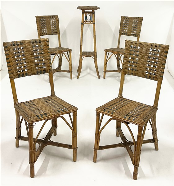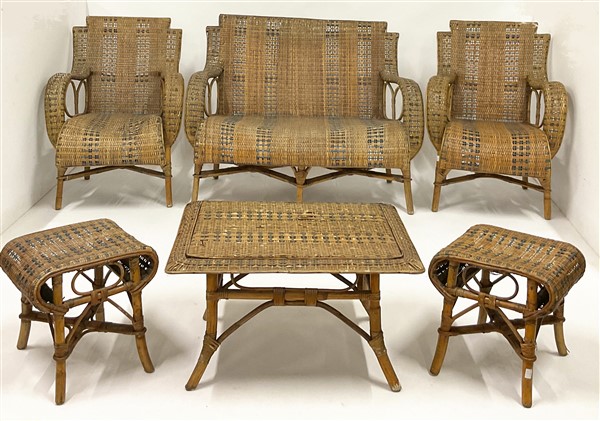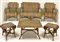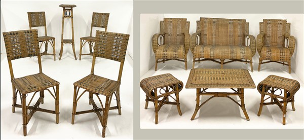 Set da esterno composto da quattro sedie, un divano, due poltrone, due pouf, un tavolino e un'alzata portavaso in malacca e giunco scortecciato. Inizio secolo XX (gravi difetti)