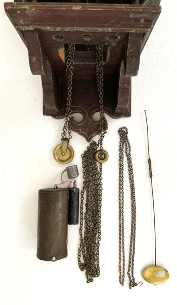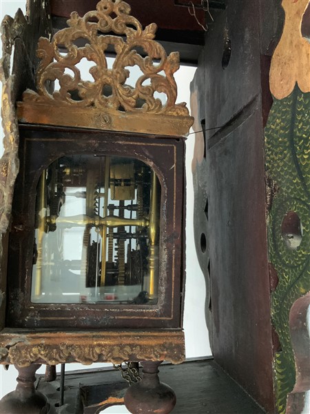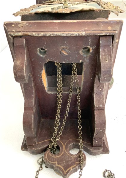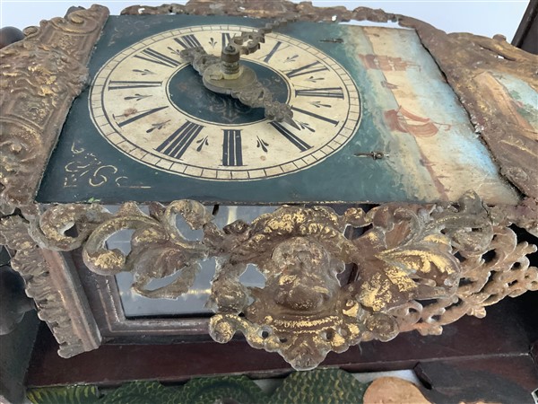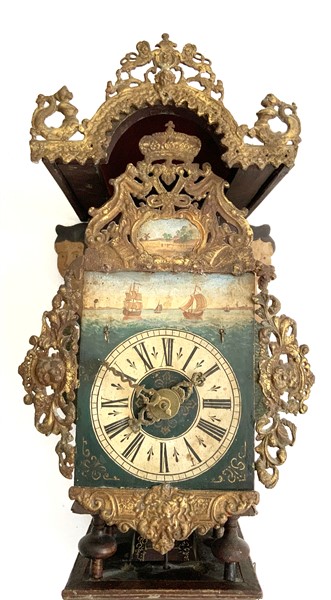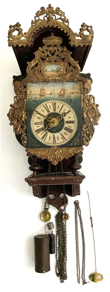 Orologio da parete a lanterna delle Isole Frisone su supporto di legno. Mostra in lamiera dipinta a scena marittima con quadrante a numeri romani contornata da fregi in metallo dorato. Secolo XIX (h tot cm 70 circa) (difetti)