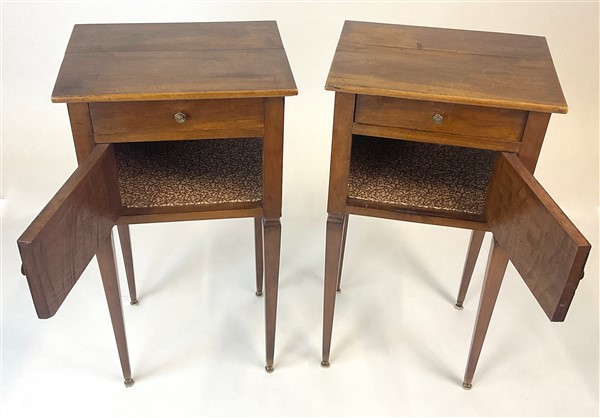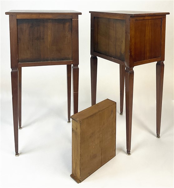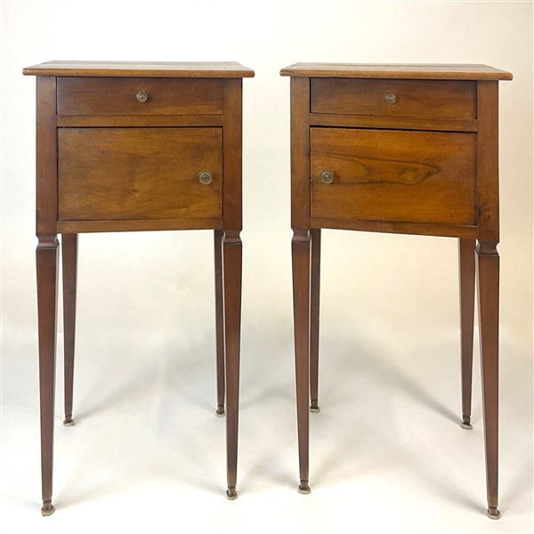 Coppia di comodini in ciliegio con fronte ad un cassetto ed un'antina, piedi a obelisco rovesciato. Inizio secolo XIX (cm 43x80x35) (difetti)