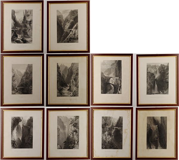 Gruppo di dieci litografie monocrome inglesi raffiguranti paesaggi (cm 22,5x20,