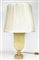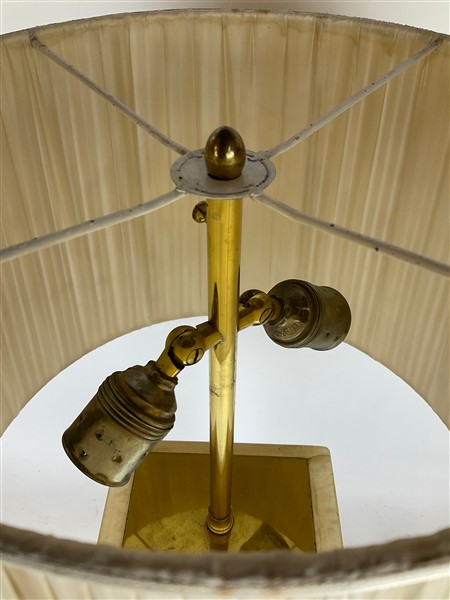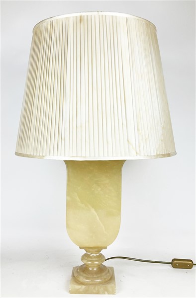 Base per lampada in alabastro a forma di vaso su base quadrata. Montatura in ottone con paralume (h tot. cm 65) (difetti e restauro)