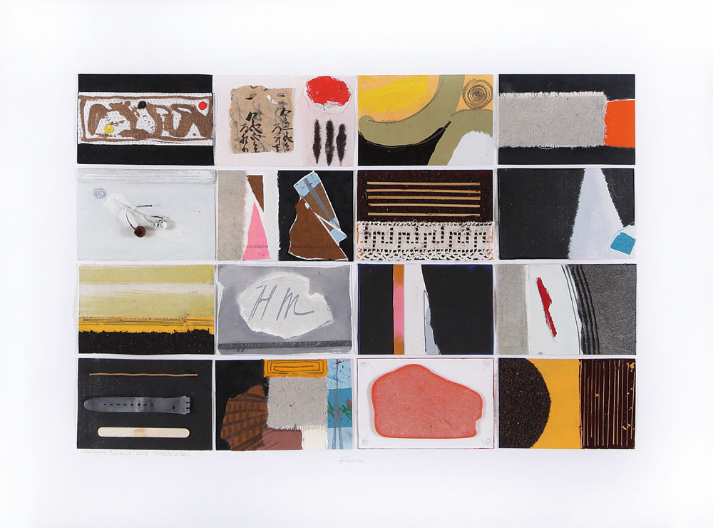 tecnica mista, collage e applicazioni su cartoncino cm. 60x80, firma in basso al centro, etichetta della Galleria Open Art (PO) al retro, etichetta della Galleria Open Art (PO) e timbro dell'Archivio Walter Fusi su foto.