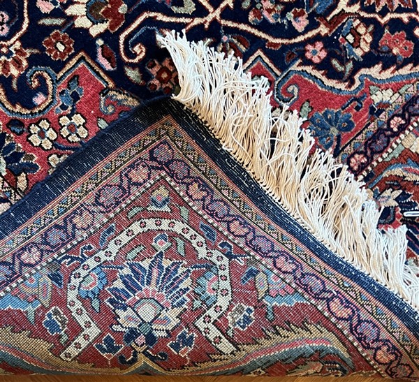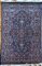 Tappeto Keshan, Persia, secolo XX. Decoro con medaglione con puntali a fondo ruggine su campo blu notte decorato con rami fioriti, bordura a meandri su fondo ruggine (cm 201x135) (lievi difetti)