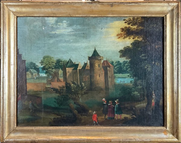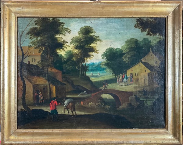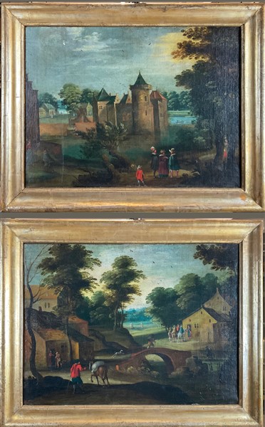 Scuola fiamminga del secolo XVIII "Paesaggi con figure" coppia di dipinti ad o