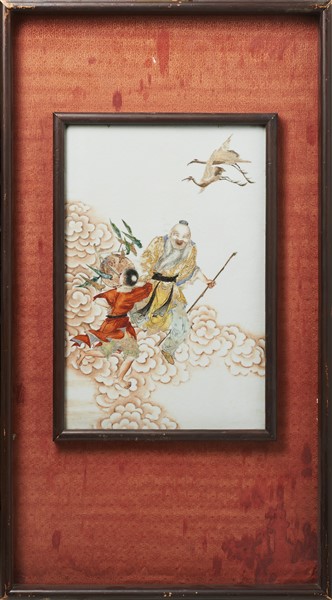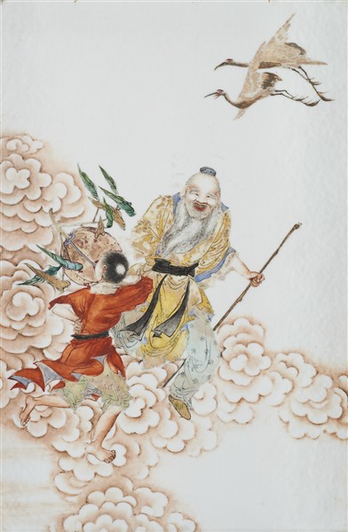 Placca in porcellana policroma raffigurante di un personaggio e un bambino sulle nuvole